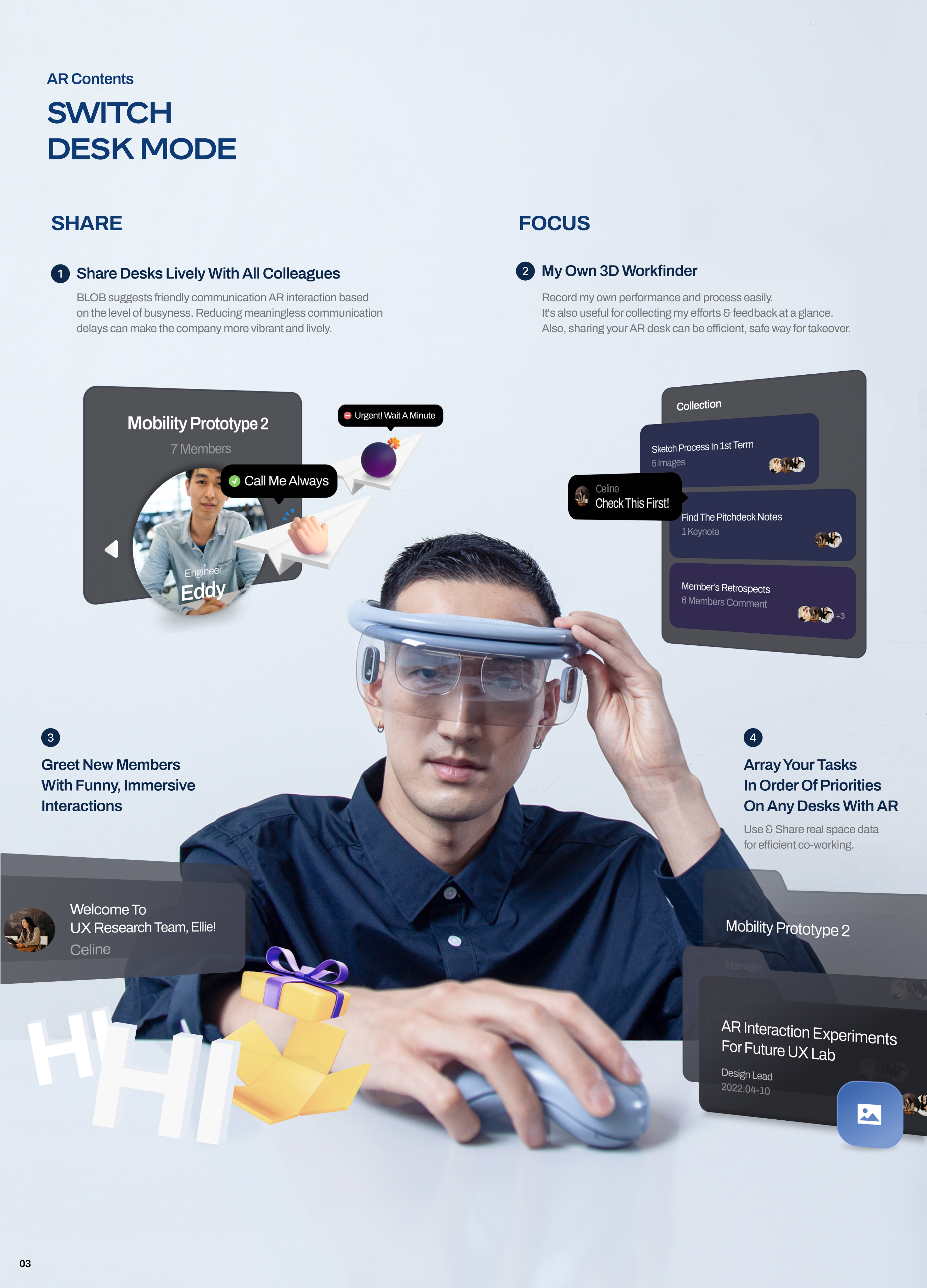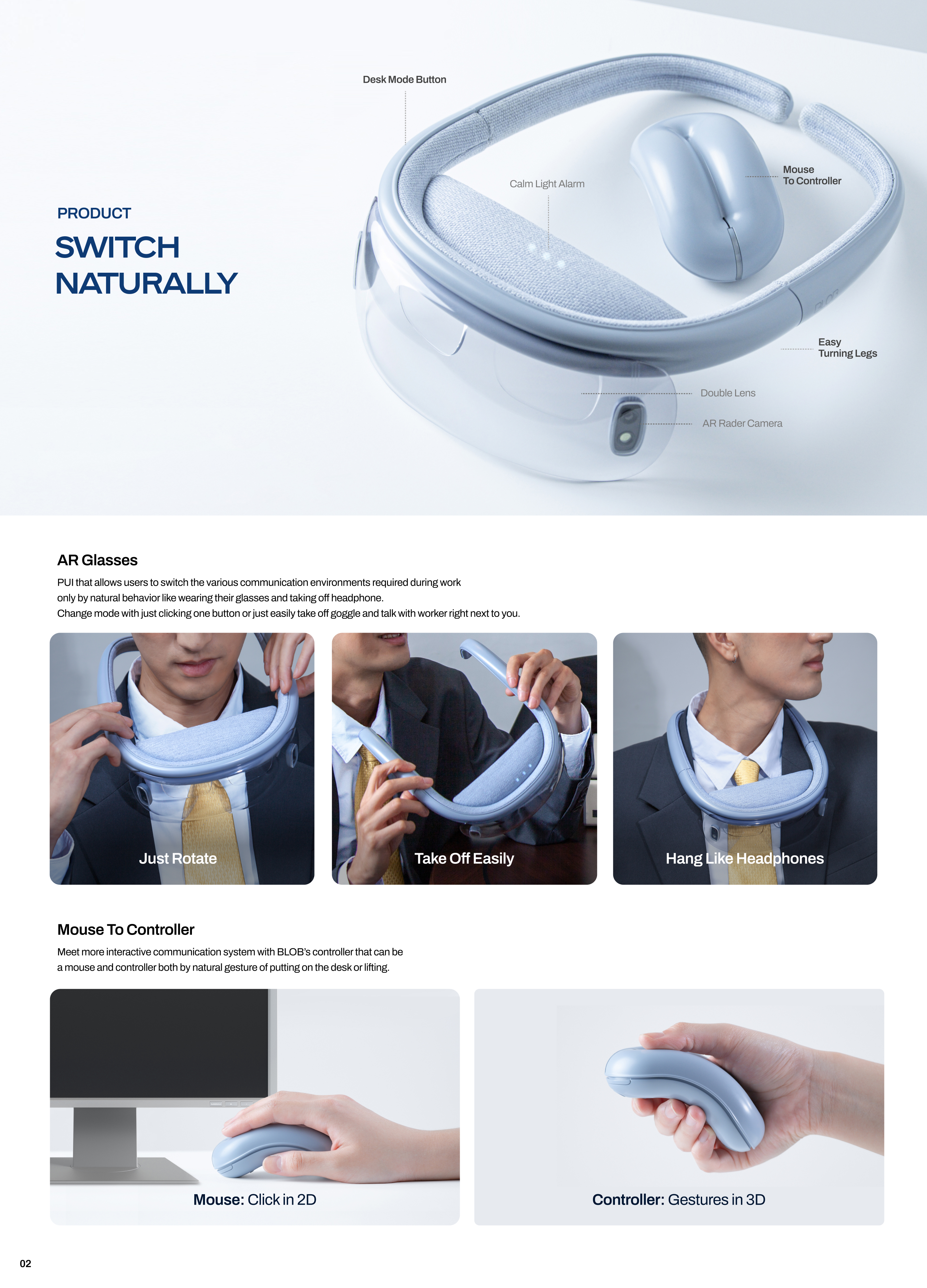 It provides a service with AR glasses and controllers that seamlessly transition 2D work environments into 3D and consider face-to-face communication. BLOB switches office with 3d contents for events, newbies/promotion training, and networking among employees. And add AR layer at each desk for bonding between workers in any type of working. Workers can interaction each other with enjoyable spatial contents, or make new work culture with components.