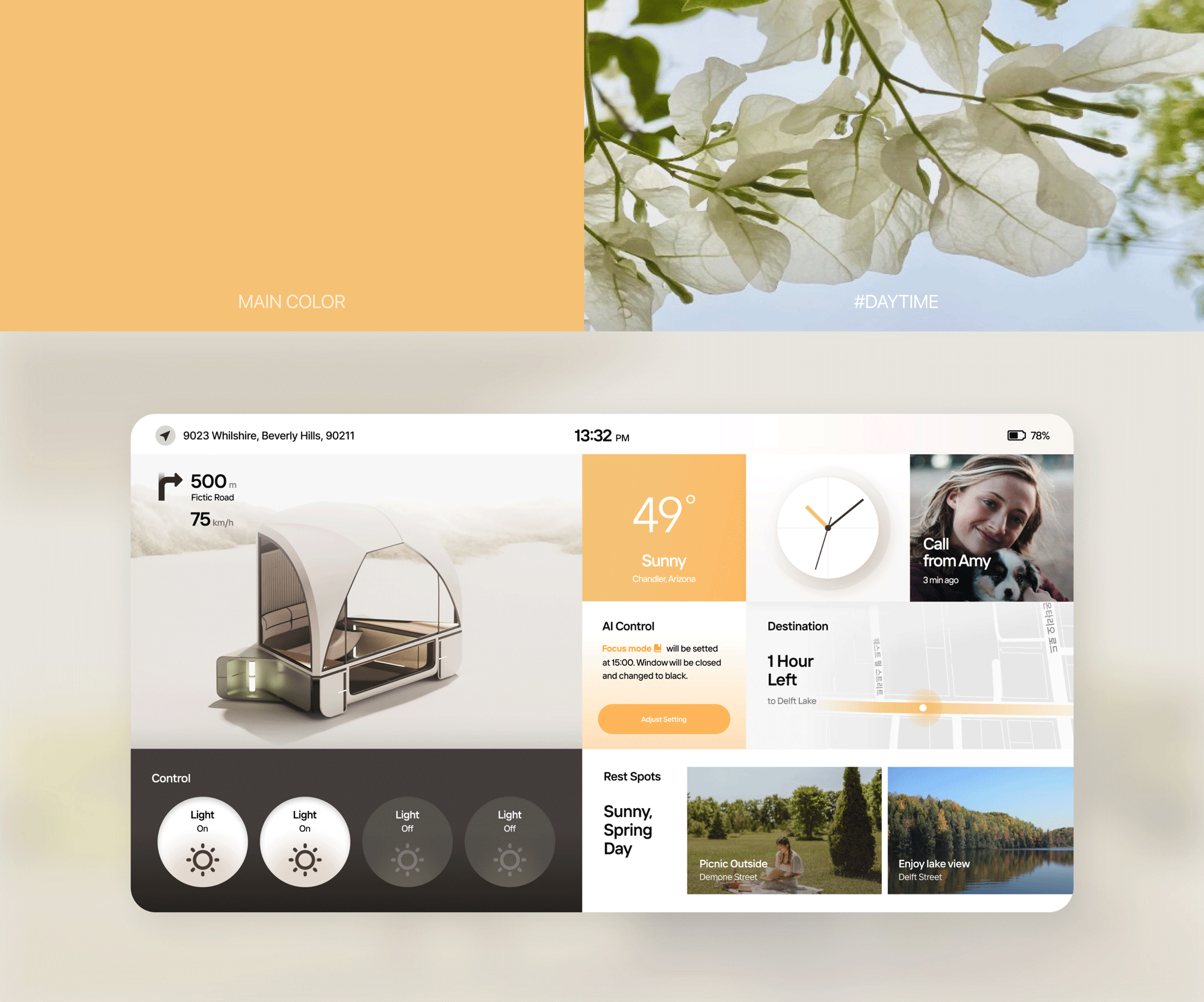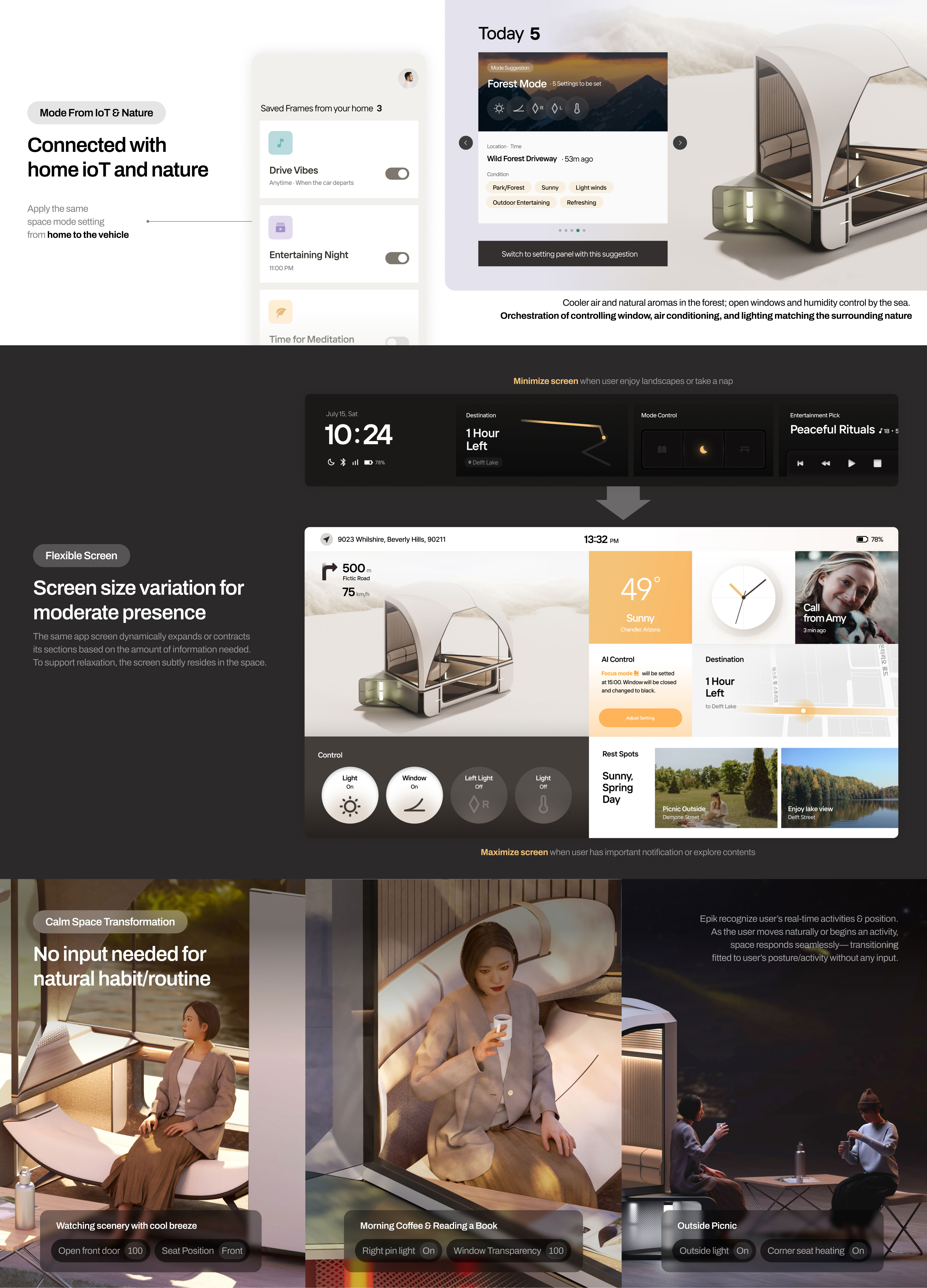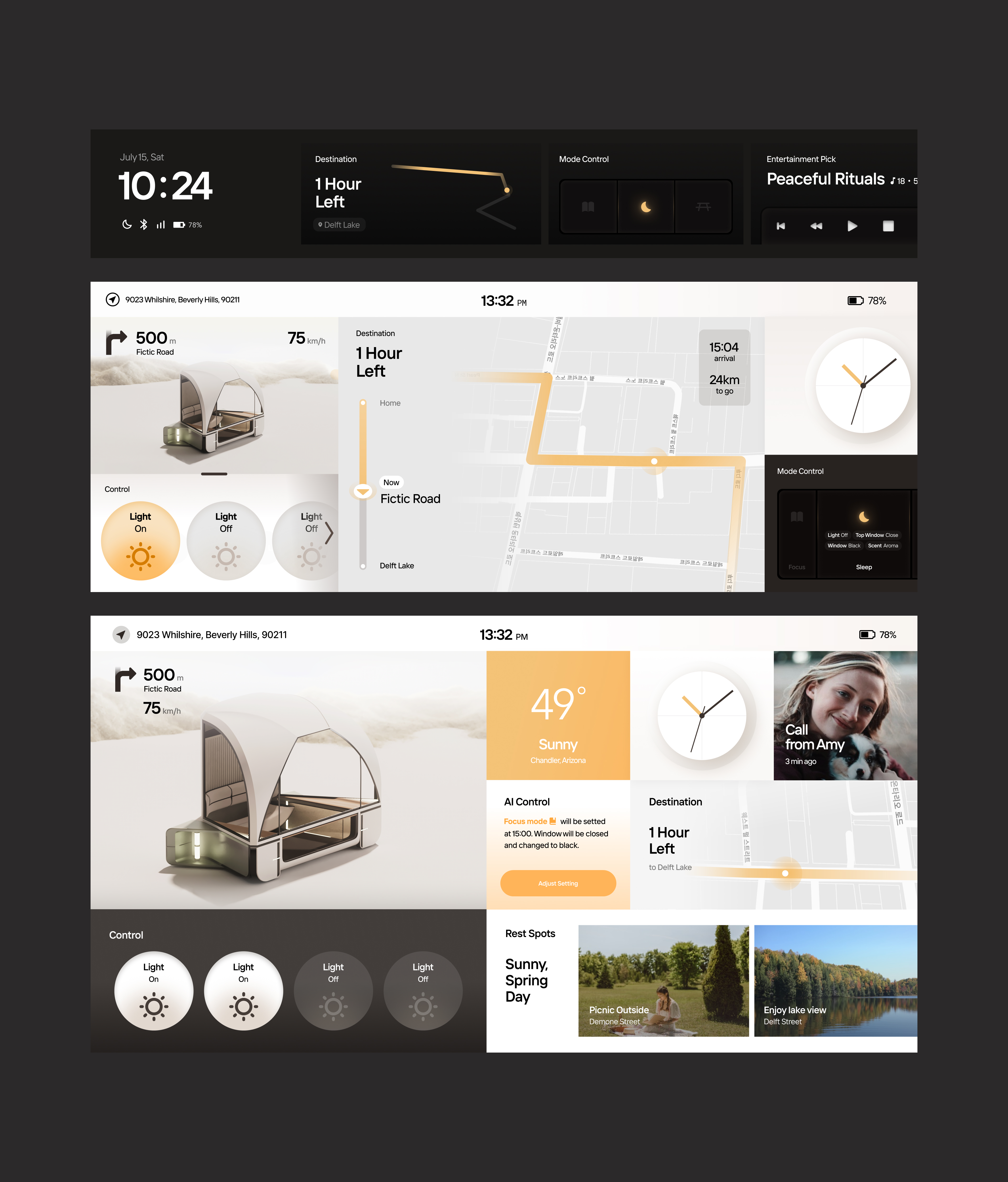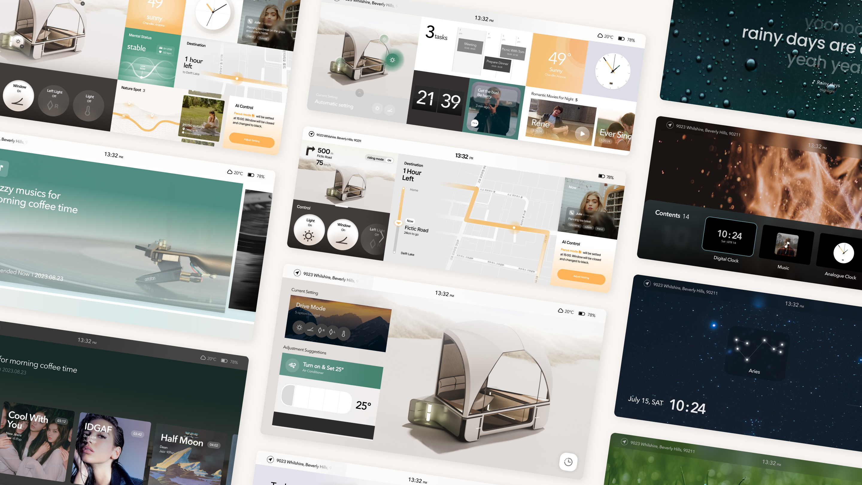 Focused on emotional UX, including a window view that changes with the sunset, route adjustments based on scenery, and music-driven experiences.
