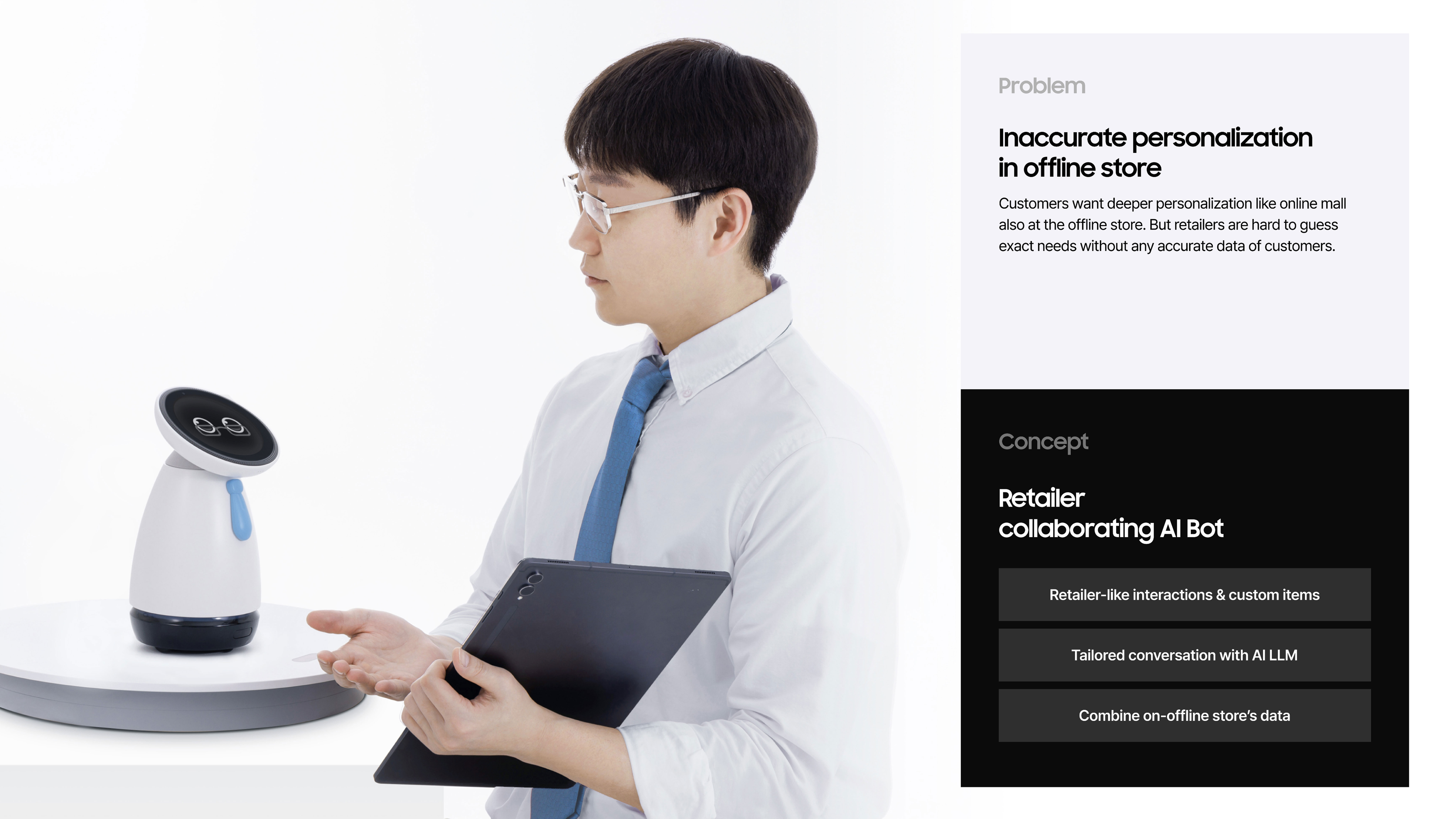 Sam is an AI robot that elevates omnichannel shopping by integrating robotic interaction with AI-driven data to deliver emotional engagement and smart personalised services. In stores, Sam engages customers vividly with LLM and gestures while analysing and sharing data with retailers to provide tailored coaching. As a trusted helper for retailers and customers, Sam is shaping the future of retail.